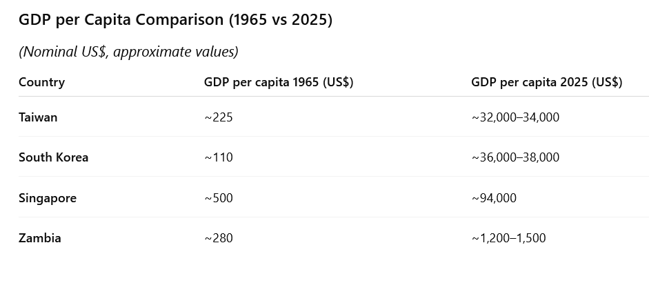 For industry players, there are significant opportunities to build competence through Industrial clusters. Drawing from my experience as part of high-precision automotive component clusters in India, I have made sustained efforts—together with MCTI and industry associations—to institutionalize this concept locally. Many countries that once had GDP per capita levels comparable to Zambia—such as South Korea, Taiwan, and Singapore—have multiplied their economic output many times over (see snapshot below). A key differentiator has been competence development and reduced dependence on natural resources. Developing clusters will in course of time address competence availability locally ( without need to import talent), and also address common problems.